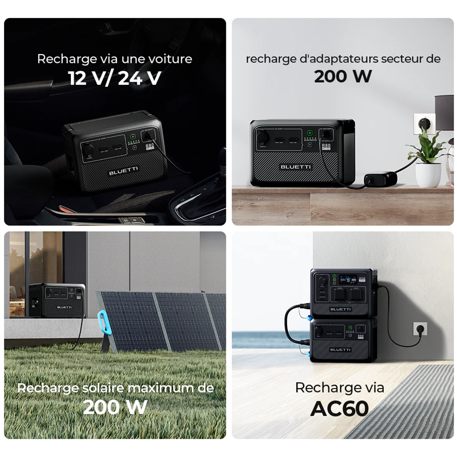 - Quatre modes de recharge : Recharge via AC60P, solaire, voiture (allume-cigare) et adaptateur.