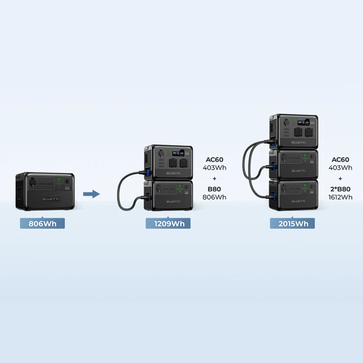 Adaptez votre puissance à vos besoins spécifiques. Enrichissez votre expérience d'énergie mobile grâce à l'ajout de batteries B80P compatibles avec vos stations d'énergie BLUETTI existantes