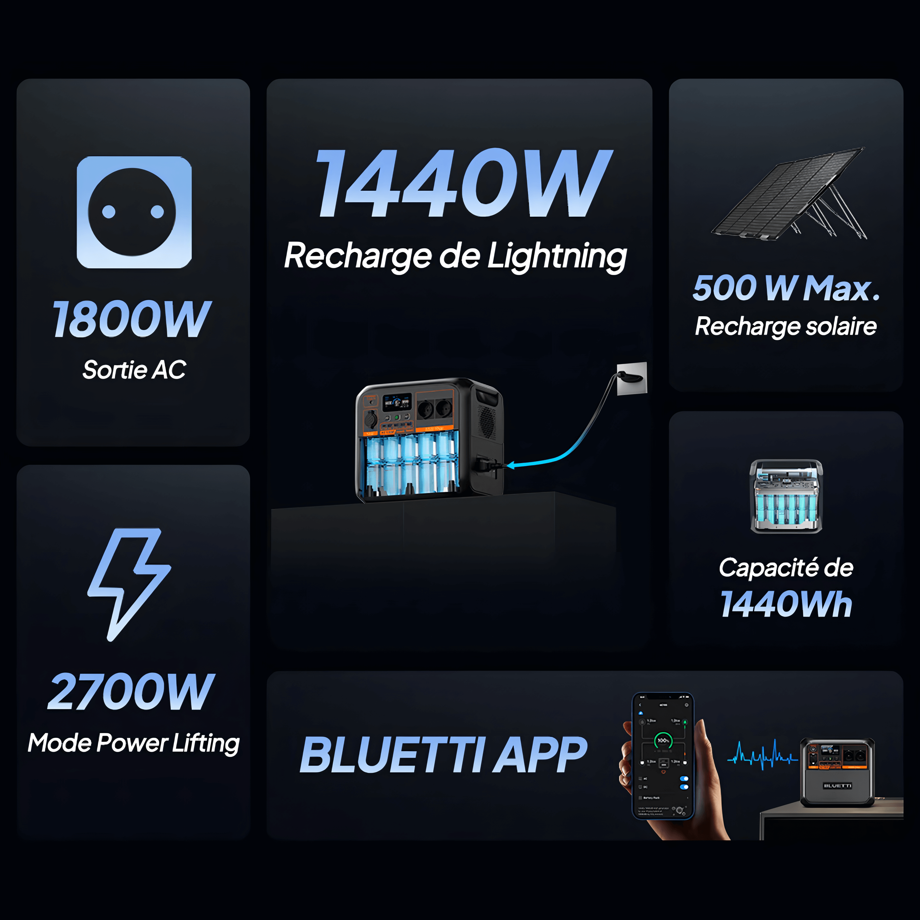Avec l'AC180P de BLUETTI, la puissance rencontre la polyvalence. Offrant 1 800 W de sortie constante et une capacité de stockage de 1 440 Wh, elle est parée pour la majorité des scénarios. Son mode d'élévation de puissance à 2 700 W assure le fonctionnement des appareils les plus exigeants. Les options de sortie variées, incluant USB, CA, et DC, plus un socle de recharge sans fil, rendent la charge de vos appareils plus pratique que jamais, en voyage comme à la maison.