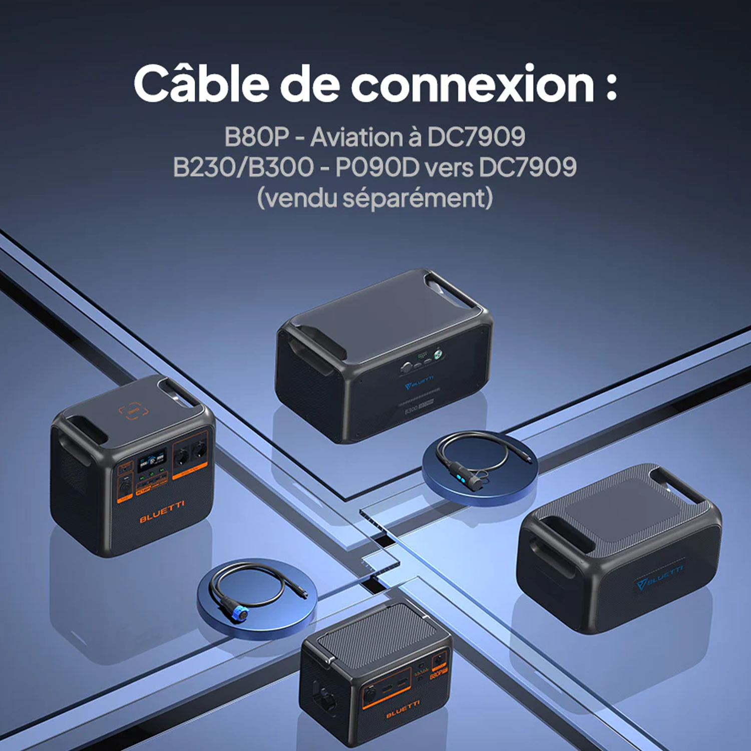 Actuellement, l'AC180P prend en charge l'extension de capacité avec des batteries B80, B230 ou B300. Pour brancher les batteries B80, vous aurez besoin du câble Aviation vers DC7909* (Vendu séparément), tandis que le câble P090D est nécessaire pour les batteries B230/B300 (Vendu séparément). Assurez-vous que les batteries sont en mode Power Bank.