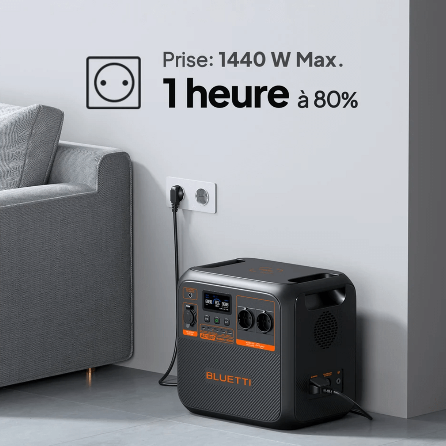 L'AC180P prend en charge une entrée de 1 440 W maximum. Branchez-la sur une prise murale, activez le mode de recharge turbo sur l'application BLUETTI et vous pouvez la recharger en 1,3 à 1,8 heure seulement.